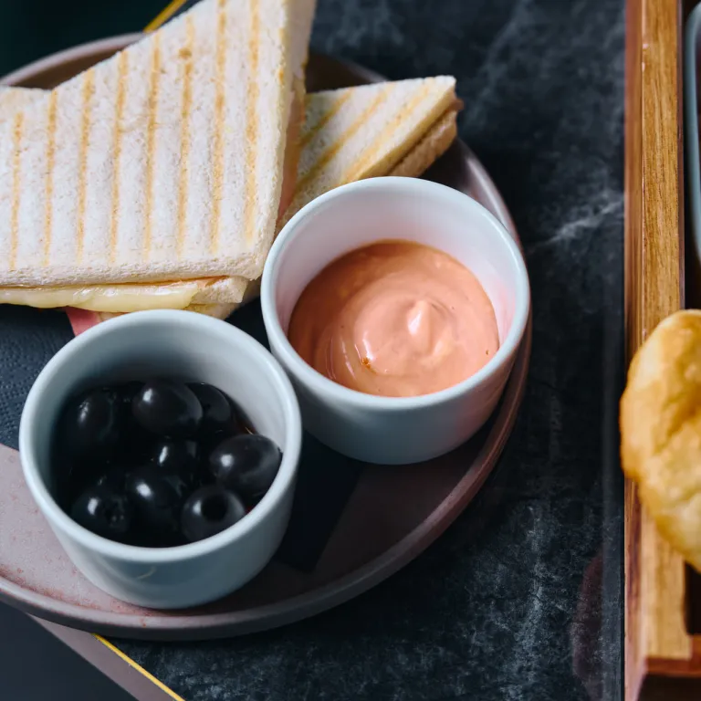 Toast s sirom in šunko, roza omaka in olive